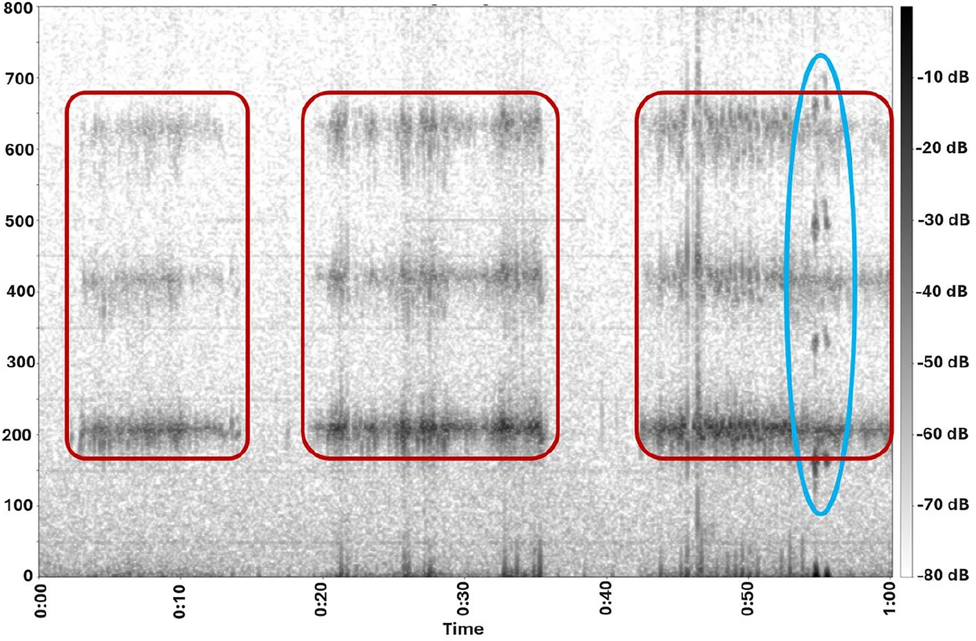 - The red boxes highlight the signal of a bumblebee (Bombus spp.) with a wingbeat frequency of about 210 Hz.
